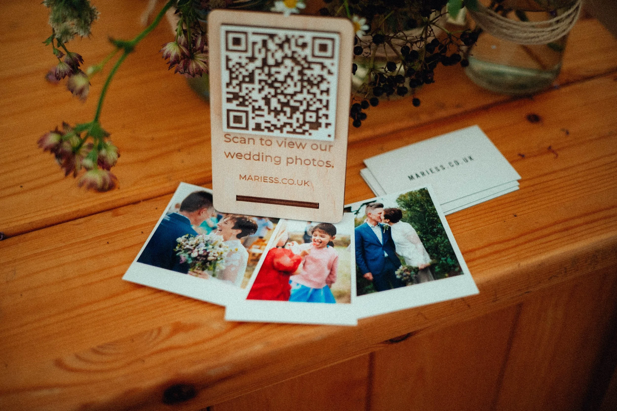 Extras: To simplify sharing your photo gallery, I provide QR code plaques. These directly link to your online gallery, allowing guests to easily bookmark it. I typically place these plaques on the bar or gift table so they’re easy to find. This saves you a job manually emailing the gallery link around to everyone.